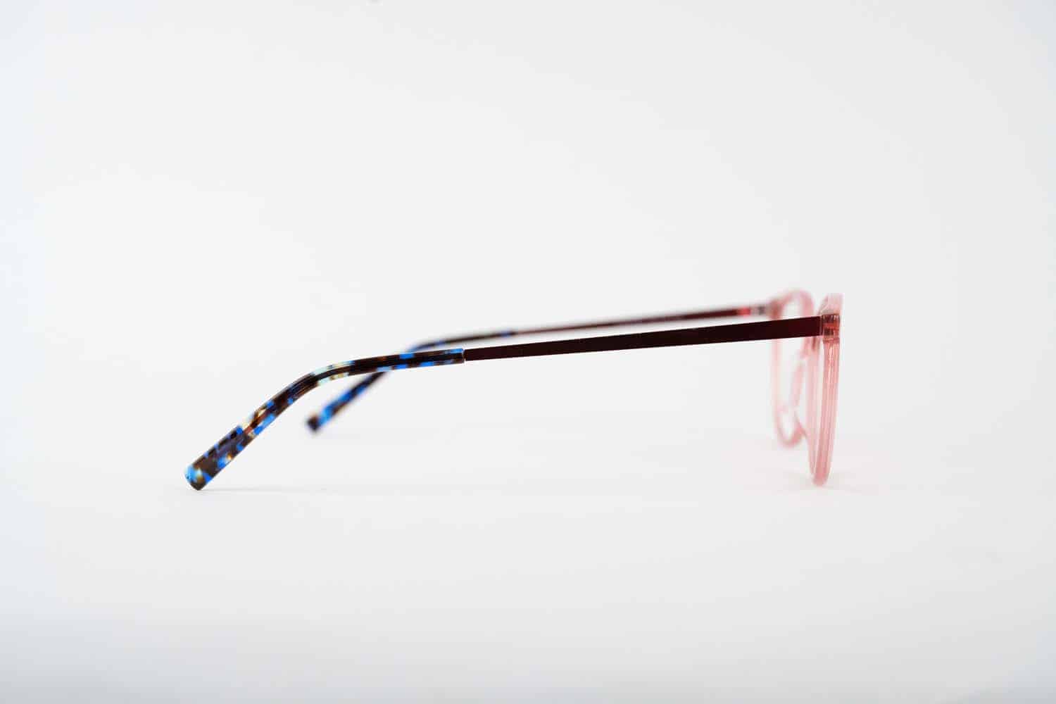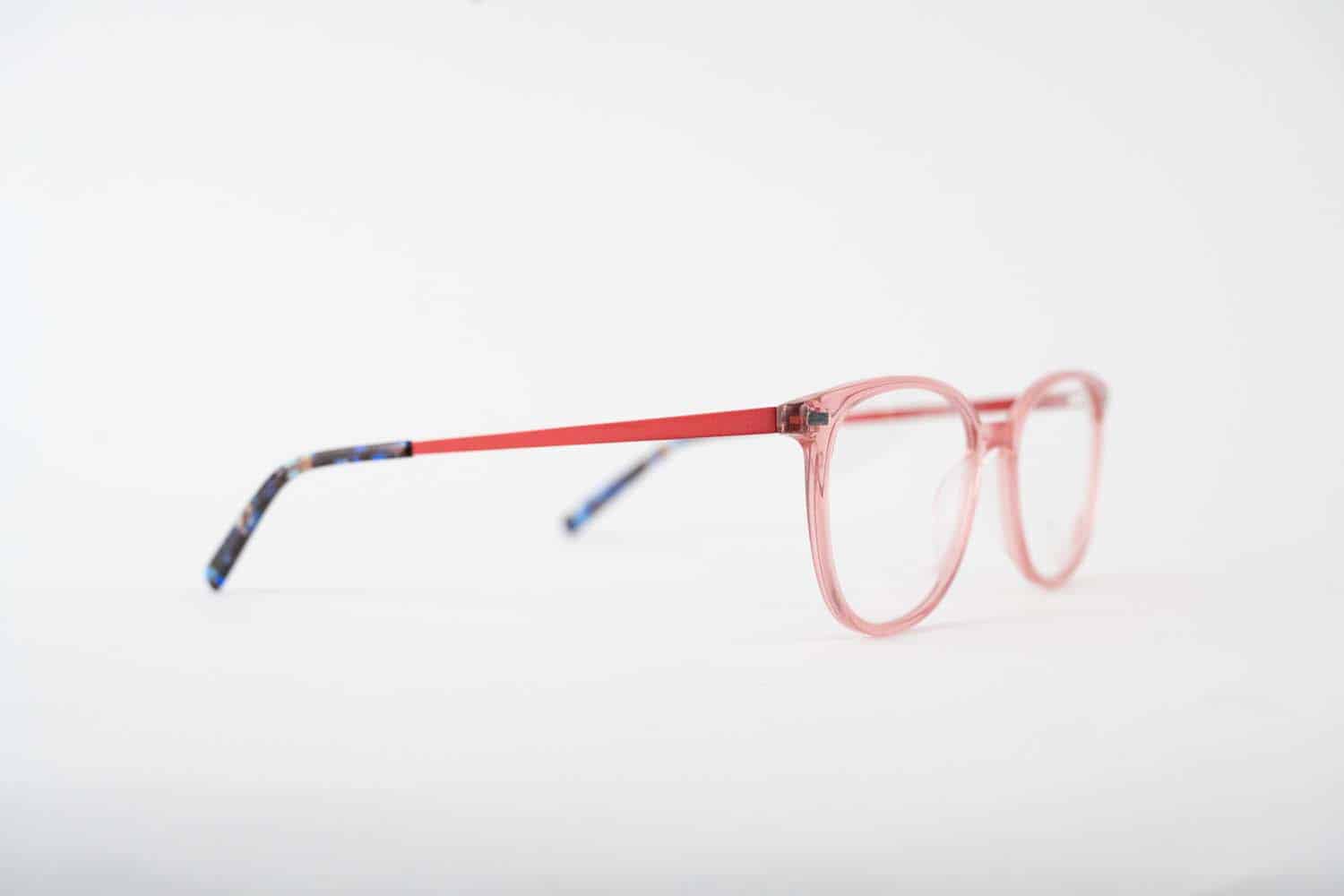 The Dazzle frame is the perfect fusion of modern and carefree. With stainless steel temples and a cherry tinted acetate frame, these playful glasses add just the right pop of color.